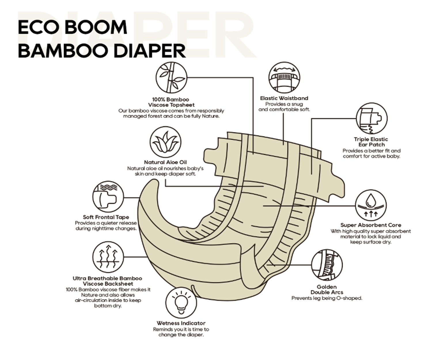 Your baby's delicate skin deserves the very best. ECO BOOM Diapers provide exceptional softness, incredible absorption, and chemical-free safety. Made from sustainable bamboo, our diapers ensure comfort without compromising on performance. Give your little one the care they deserve.